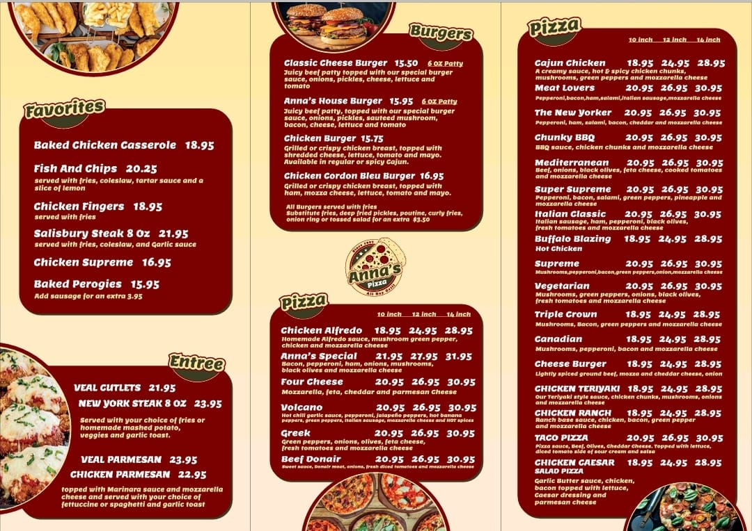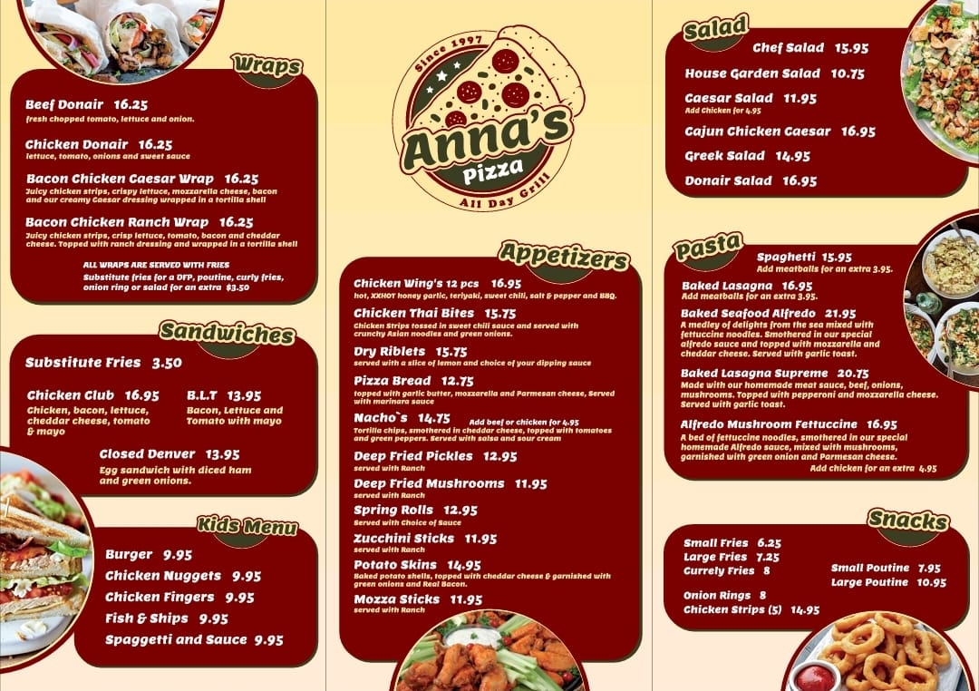 At Anna's, their menu boasts an enticing selection of pizzas and family-friendly items. The Canadian Pizza, topped with pepperoni, bacon, and mushrooms, is a must-try for anyone seeking that classic flavor, particularly when served with crispy wings and a refreshing pop for just CA$27.99. If you’re looking for something a bit different, the Cheese Burger Pizza, featuring house-made beef with an exquisite blend of herbs, is sure to impress, also paired nicely with wings and pop for the same price. However, for the ultimate experience, don’t miss the Triple Crown Pizza, a symphony of green pepper, bacon, and mushroom that is bound to delight your taste buds.